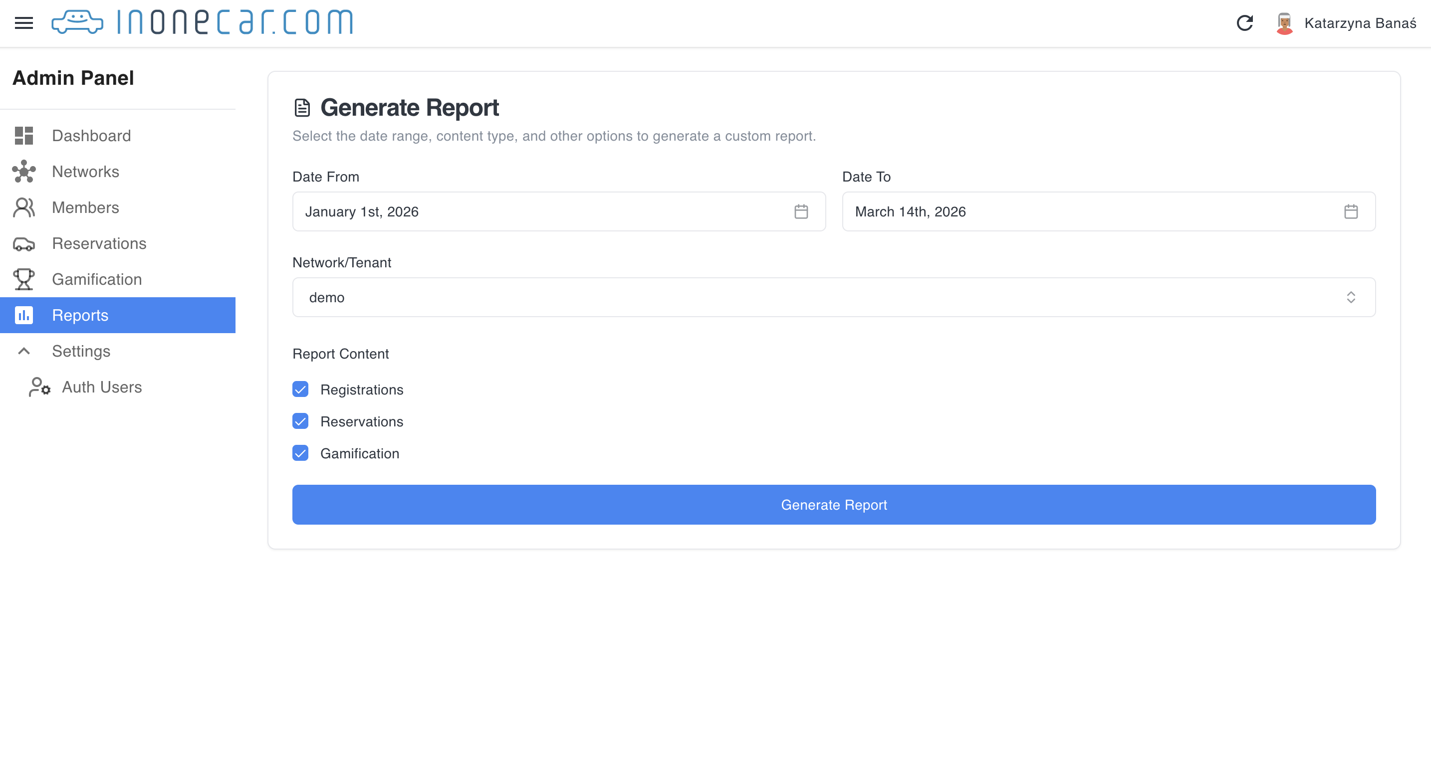 Panel administracyjny umożliwia generowanie raportów obejmujących aktywność użytkowników, przejazdy oraz dane związane z programem motywacyjnym.